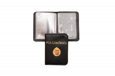 Magyar címerrel és „Polgárőrség” felirattal ellátott bőr igazolványtartó fekete színben.