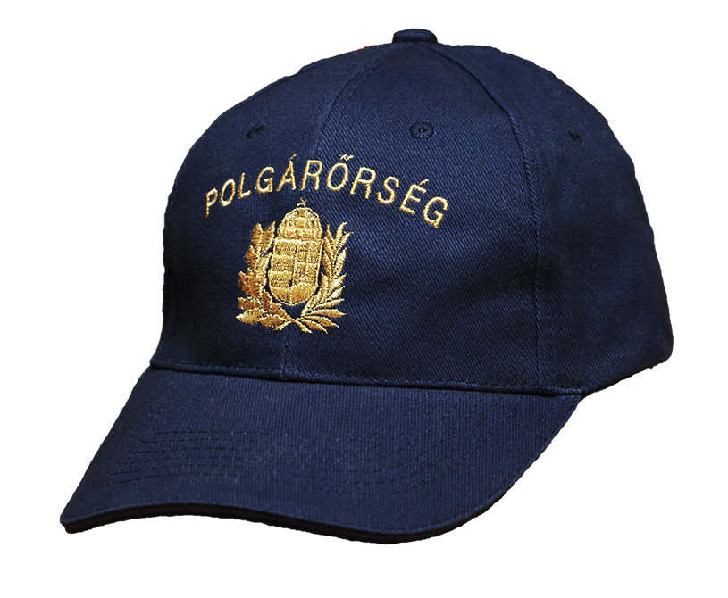 Fejmérethez állítható baseball sapka hímzett arany címerrel és "Polgárőrség" felirattal.