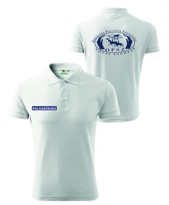 Fehér piké póló, elől „Polgárőrség” felirattal, hátul a lovas tagozat címerével.