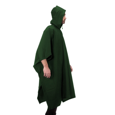 Zárt szabású, fűzővel állítható kapucnis esőponcsó, hátul „Polgárőrség” felirattal ellátva.