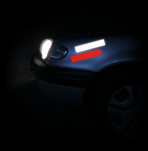 Öntapadós fényvisszaverő szalag, mely autóra, motorra vagy kerékpárra ragasztható a jobb láthatóság érdekében. Ruhára varrható változatban is.