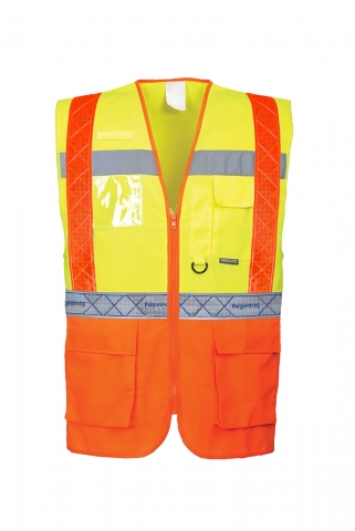 Sok zsebbel, mobil-, toll és azonosítókártya tartóval ellátott mellény, neon sárga - neon narancs (VM01N) és neon sárga - sötétkék (VM01K) színösszeállításban. Vállon átfutó és has körül futó fényvisszaverő részeken extra fényvisszaverő szalaggal ellátva: - POLGÁRŐRSÉG feliratú PVC fényvisszaverő csík vízszintesen, - NEONNARANCS PVC fényvisszaverő csík függőlegesen.