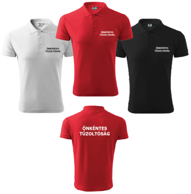 200 grammos, kevert szálas anyagból készített galléros póló fehér, piros vagy fekete színben. Elől-hátul "Önkéntes Tűzoltóság" felirattal, vállon tépőzár előkészítéssel ellátva.